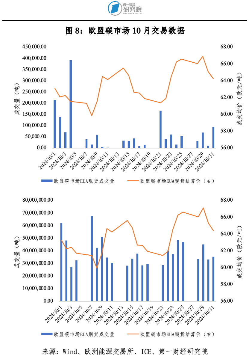 10月歐盟碳排放配額(EUA)現(xiàn)貨成交量161.50萬噸,期貨成交量9.04億噸。10月EUA現(xiàn)貨結(jié)算價(jià)最低59.87歐元/噸,最高66.93歐元/噸;期貨結(jié)算價(jià)最低59.98歐元/噸,最高67.13歐元/噸。