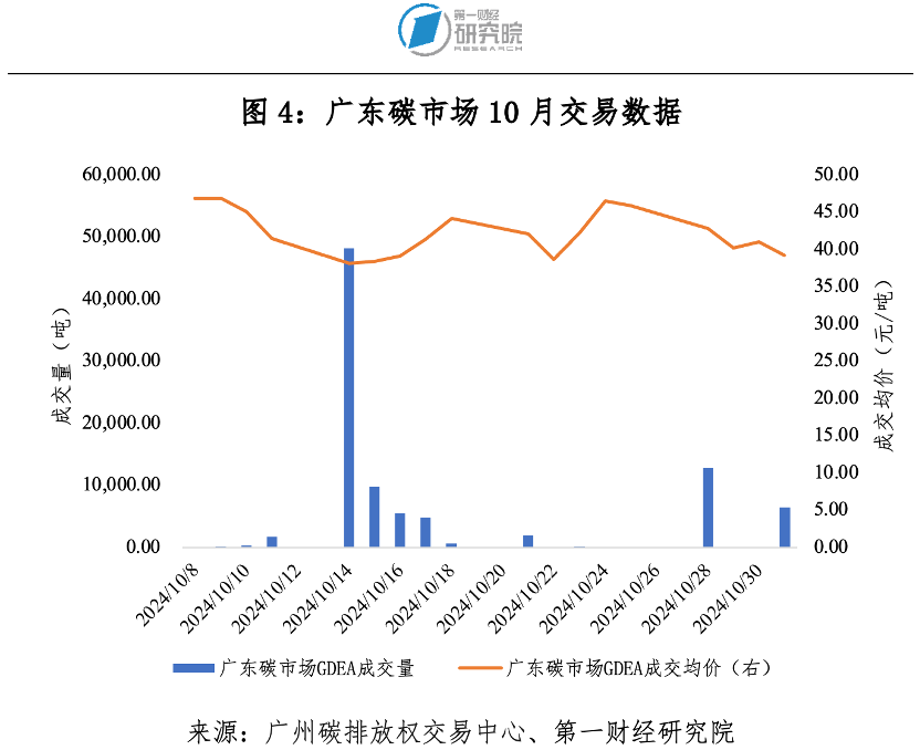 10月廣東碳市場(chǎng)碳排放配額(GDEA)成交量9.27萬噸,成交額364.98萬元。期間,最高價(jià)50.96元/噸,最低價(jià)34.51元/噸,成交均價(jià)39.38元/噸。10月最后一個(gè)交易日收盤價(jià)39.23元/噸,較9月最后一個(gè)交易日收盤價(jià)43.02元/噸下跌8.81%。截至10月31日,GDEA累計(jì)成交量2.29億噸,累計(jì)成交額66.17億元。