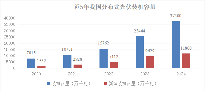 截至2024年末,全國(guó)光伏發(fā)電裝機(jī)容量達(dá)8.86億千瓦,同比增長(zhǎng)45%,排在火電之后,位居第2位,其中集中式光伏5.11億千瓦,分布式光伏3.75億千瓦。全年光伏新增裝機(jī)2.78億千瓦,同比增長(zhǎng)28%,其中集中式光伏1.59億千瓦,分布式光伏1.18億千瓦。全年光伏發(fā)電量達(dá)到8341億千瓦時(shí),同比增長(zhǎng)44%,但仍落后于核電的發(fā)電量,排在第5位。全年發(fā)電利用小時(shí)數(shù)為1211小時(shí),發(fā)電上網(wǎng)利用率96.8%,較上年有所降低。