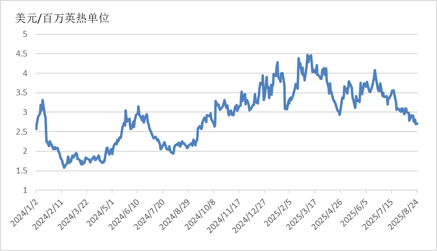 8月,美國天然氣價格震蕩下行。8月上旬,美國大部分地區(qū)氣溫下降,制冷需求減少,居民、商業(yè)用氣量減少5.2%,發(fā)電用氣量下降15.6%,為今年以來單周最大降幅。美國LNG出口終端穩(wěn)定高效運行,全美液化天然氣加工量維持在160億立方英尺/日左右。供應(yīng)方面,7月以來,美國活躍天然氣鉆機數(shù)量增長至近兩年高位,推動總產(chǎn)量提升至1065億立方英尺/日左右,較去年同期上漲2.79%。庫存方面,截至8月8日,周度庫存增加560億立方英尺,遠超于市場普遍預(yù)期的530億立方英尺,與過去5年同期均值相比庫存上漲6.56%。高于歷史同期的產(chǎn)量和充足的庫存加劇看空壓力,美國天然氣價格承壓下行。8月4日,美國Henry Hub天然氣價格收于2.952美元/百萬英熱單位,時隔3個月再次下降至3美元/百萬英熱單位以下。8月中下旬,美國多州氣溫上升,推升制冷需求,帶動天然氣總消費量上漲。但受颶風“艾琳”侵擾影響,F(xiàn)reeport、Sabine Pass、Cameron LNG出口終端相繼進入檢修,全美液化天然氣加工量降至每日155億立方英尺左右。供應(yīng)方面,隨著鉆機數(shù)量階段性地穩(wěn)定增加,全美天然氣產(chǎn)量增加至1070億立方英尺/日左右,持續(xù)刷新歷史高位。庫存方面,盡管庫存增量不及市場預(yù)期,但仍高于過去5年同期均值。在氣溫下降預(yù)期增強、颶風或?qū)⒊掷m(xù)影響液化天然氣出口、全美天然氣產(chǎn)量持續(xù)刷新歷史高位、天然氣庫存充足、競爭性能源價格下跌等多重利空因素影響,8月22日,Henry Hub天然氣期貨價格收于2.692美元/百萬英熱單位,這是自2024年11月以來Henry Hub天然氣期貨價格首次下降至2.7美元/百萬英熱單位以下。