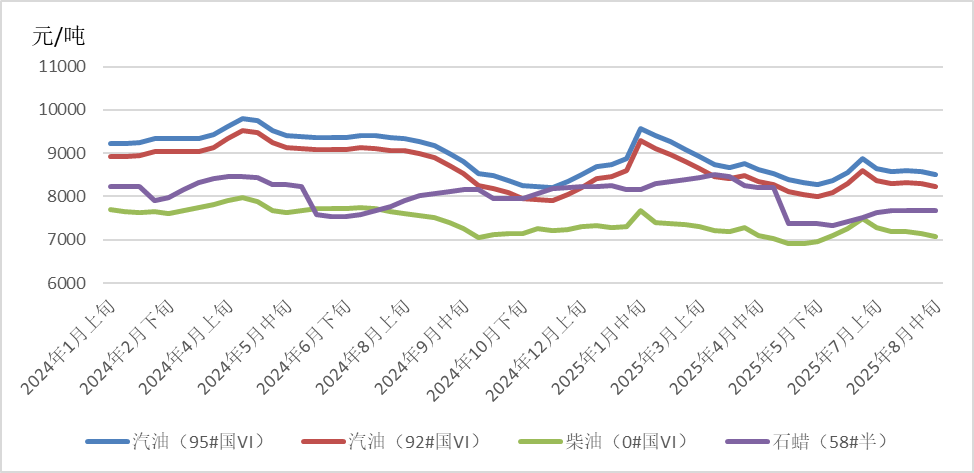 8月中旬,IEA上調(diào)全球石油供應(yīng)過剩預(yù)期,美國能源信息署(EIA)預(yù)測2025年美國原油日產(chǎn)量將創(chuàng)1341萬桶紀錄,夏季駕駛旺季臨近尾聲原油需求下降預(yù)期增強,中美關(guān)稅暫停措施再延長90天等因素推動國際油價延續(xù)下跌態(tài)勢。然而,市場對美聯(lián)儲9月降息的預(yù)期增強,阿拉斯加美俄峰會并未取得實質(zhì)性進展,俄烏局勢不確定性推升地緣風險溢價,受上述因素影響,國際油價跌幅有所收窄。
