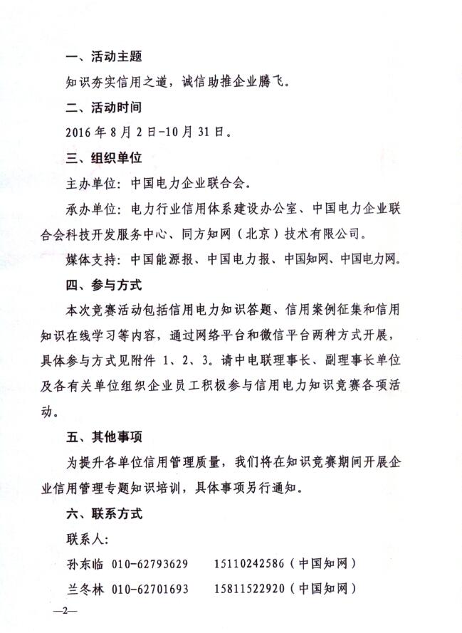 為進一步落實中共中央、國務(wù)院《關(guān)于進一步深化電力體制改革的若干意見》(中發(fā)〔2015〕9號),深化《社會信用體系建設(shè)規(guī)劃綱要(2014-2020年)》精神,普及信用知識,提升電力行業(yè)從業(yè)人員誠信意識,結(jié)合國家有關(guān)部委對信用體系建設(shè)工作的最新要求,中國電力企業(yè)聯(lián)合會攜手清華同方知網(wǎng),再次強強合作,共同舉辦2016“信用電力”知識競賽活動。